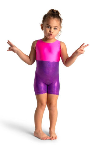 This Nylon/Spandex gymnastics biketard features a high scoop neck, scoop back, wide tank straps, and modest length inseam. The print is bold and colorful, showcasing shining, prismatic metallic splatters. As supportive as it is flexible, the fabric adapts to every moment of your little star, stretching and rebounding as she moves across the floor.