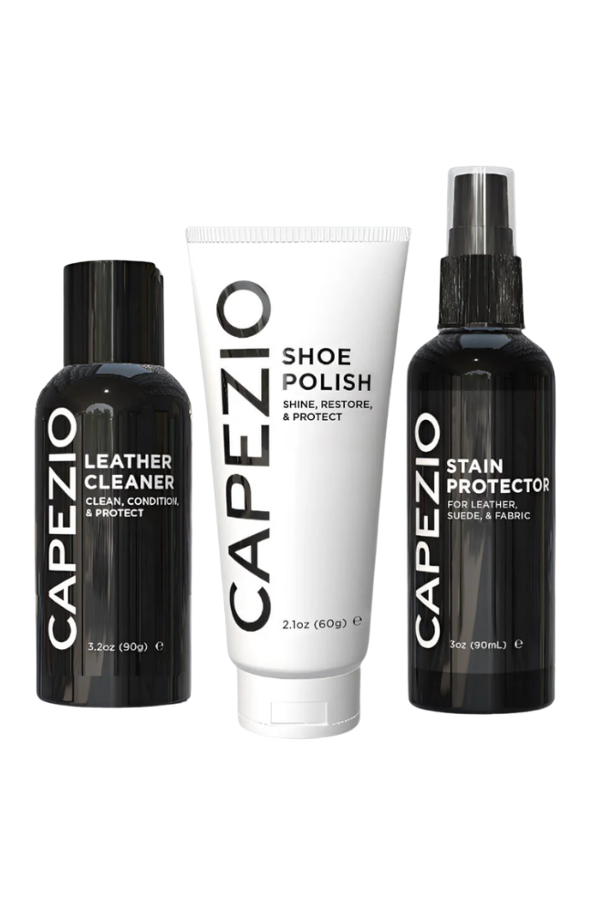 Keep your footwear looking its best with this all-in-one care kit. Designed for leather and synthetic shoes, this set helps clean, condition, and protect against rust and wear - extending the life of your shoes with ease. Each bundle includes: 1 Leather Cleaner, 1 Shoe Polisher, 1 R&S Protector, and 1 Microfiber Cloth. Capezio Leather Cleaner is formulated with Brazilian Carnauba wax to gently remove dirt while conditioning and softening all types of smooth leather. Safe and effective, it restores shine and extends the life of your footwear. Capezio Stain Protector shields shoes from water, dirt, and discoloration. Safe for smooth leather, suede, nubuck, and more, it provides invisible protection without altering the material's look, feel, or breathability. Capezio Shoe Polisher restores shine, flexibility, and hydration to leather footwear. Made with Brazilian Carnauba wax, it covers scuffs and helps protect against wear and tear. Features a built-in sponge applicator for easy, mess-free application.