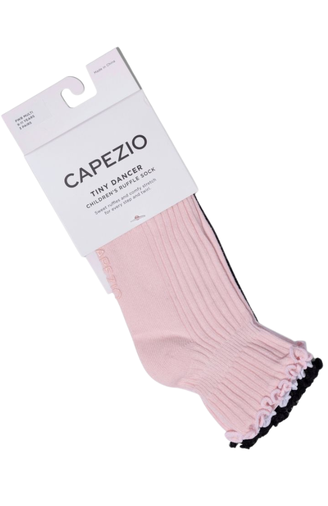 Add a pop of color and comfort to every step with our new Children's Scalloped-Edge ribbed ankle socks. Made from a soft, breathable cotton blend with a touch of elastane for stretch, these socks are perfect for everyday wear or studio time. Each 3-pack includes one pair each in black, pink, and white—ideal for mixing and matching. Finished with a silicone heat-transfer Capezio logo on the sole for subtle grip and style.